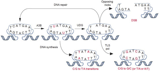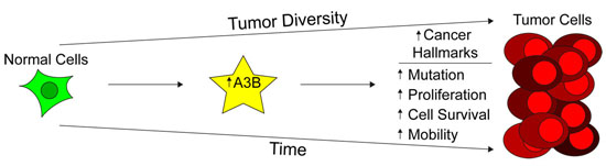The expression of enzymes that catalyze DNA C-to-U deamination poses an inherent threat to cells. Undoubtedly, many mechanisms exist to minimize these threats and maximize beneficial outcomes. Nevertheless, considerable evidence supports the hypothesis that enzyme-catalyzed DNA deamination contributes to many distinct stages of cancer progression, from the initial stages of transformation to the evolution of drug resistance (see figure below). Several projects in the Harris Laboratory are dedicated to understanding how DNA deaminases contribute to human carcinogenesis and developing novel methods to mitigate this pathogenic outcome.